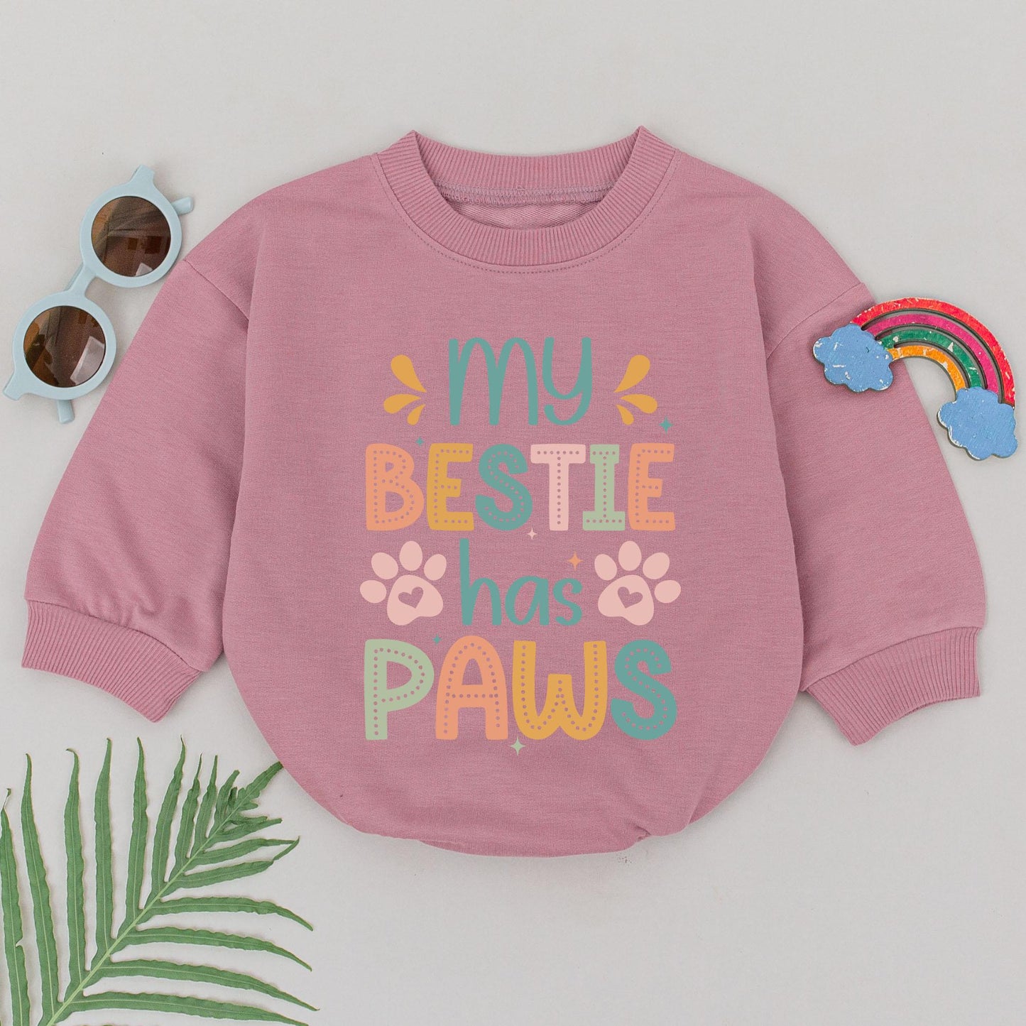 Celebrate the special bond with your furry best friend in this incredibly charming romper! Featuring the heartwarming "My Bestie Has Paws" slogan surrounded by playful paw prints and twinkling starbursts in a delightful retro color palette of orange, pastel green, and peach, this outfit is pure joy for your little one. It’s designed to evoke a sense of whimsical, vintage fun, perfect for capturing those precious early moments. Imagine your baby looking absolutely adorable in this unique piece, a perfect way to show off their love for their canine companion. This romper makes for an unforgettable gift, whether for a baby shower, a coming-home outfit, or just a delightful surprise for any proud pet parent. Let your little one wear their heart on their sleeve – or rather, on their romper – and spread smiles wherever they go.