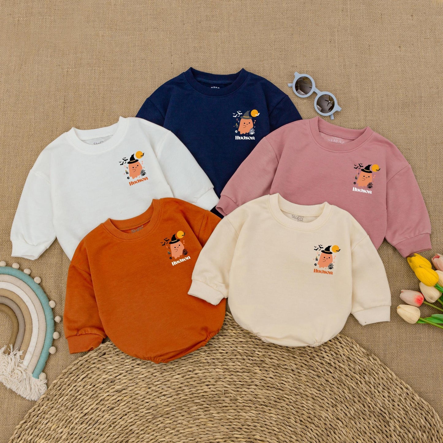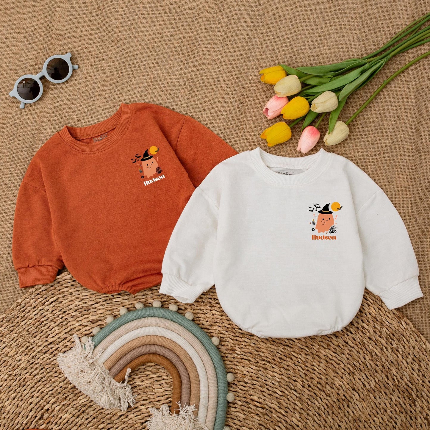 Celebrate your little one's spooky first birthday with this adorable romper! Imagine the smiles as your baby boy rocks this Halloween-themed bodysuit at his party. This charming bubble romper features a cute ghost design, perfect for fall festivities. Made with soft, comfortable fabric, it's gentle on delicate skin. Whether it's for a Halloween baby shower gift or a spooky season photoshoot, this romper captures the magic of his special day. It's a memorable keepsake to cherish these precious first moments. Get ready for a spooktacular celebration and create lasting memories with this sweet outfit!
