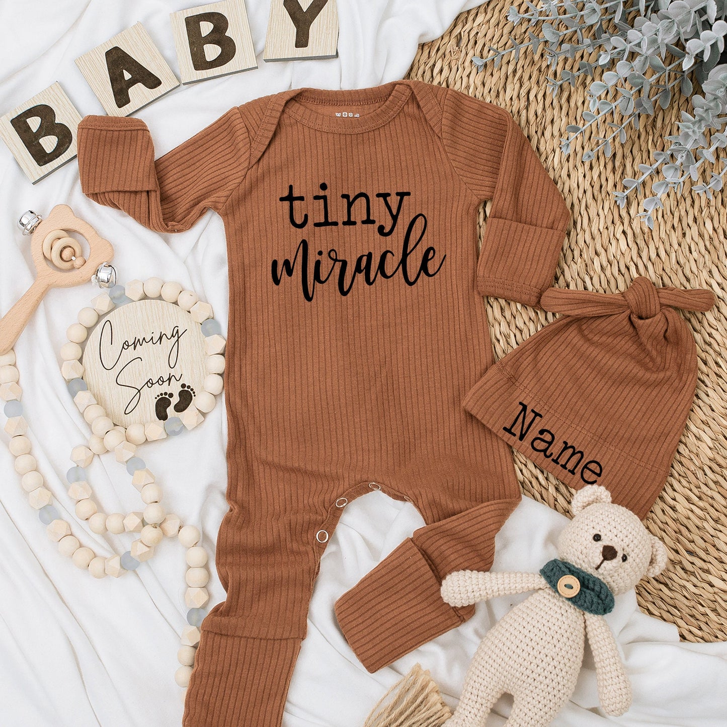Tiny Miracle Baby Bodysuit and Hat Set Custom Name Outfit for New Baby Newborn Clothing Boy Girl Celebration Gift