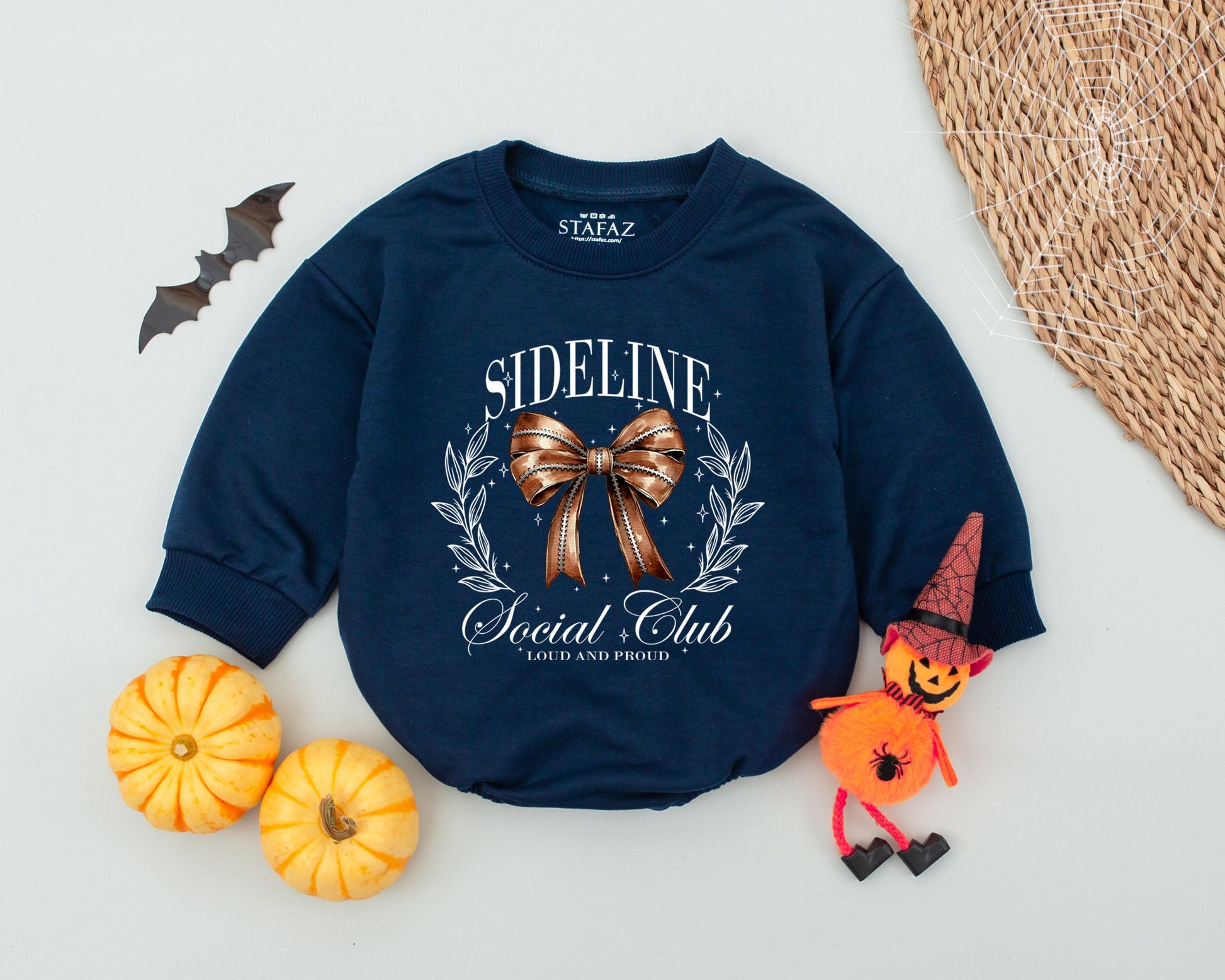 Imagine your little one stealing the show at her first game day! This darling baby romper features a vintage-inspired design with a large, detailed brown bow surrounded by leaves and playful starbursts. The words "SIDELINE Social Club LOUD AND PROUD" add a touch of sporty charm. Picture her cuddled up in this soft bodysuit, ready for a fall baby shower or a cozy afternoon of football fun. It's the perfect outfit for capturing those precious autumn memories, a unique and comfy statement for your baby girl's wardrobe. Dress her in this special piece and let her shine with vintage flair and game day spirit!